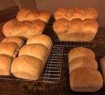 When it is ready punch down the bread ball , next cut pieces off , I do 3 balls per greased bread pan (but you can use 1 ball ). when all the bread is in bread pans place in a warm spot covered and let it rise until it has doubled in size . Bake at 350 for 30 to 35 mins depending on your oven will be a golden brown in color . Makes about 5 loaves per batch .