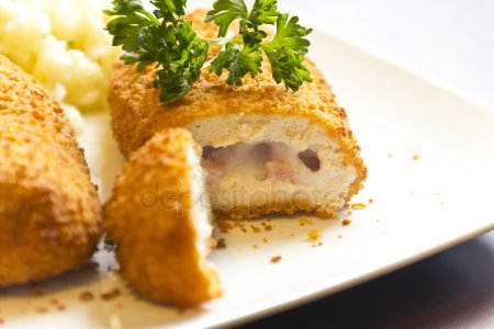 Combine all dry ingredients in a bowl mix together .Pound chicken until thin , lay a slice of ham and cheese on top of each chicken breast then roll up and secure with toothpicks.Dip rolled chicken breast into melted butter then roll in bread crumbs .Place in a casserole dish and bake at 350 for 40 mins .Always soak toothpicks in water before using them so they don’t burn in the oven .