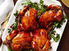Cut hens in half through the breast bone and lay flat in a casserole dish .Next in a bowl mix rest of the ingredients together then brush the mixture on the top of the hens .Bake at 350 for about 20 mins and reapply left over mixture bake for another 2o to 25 mins.This glaze can be used on chicken, duck, pork or beef.