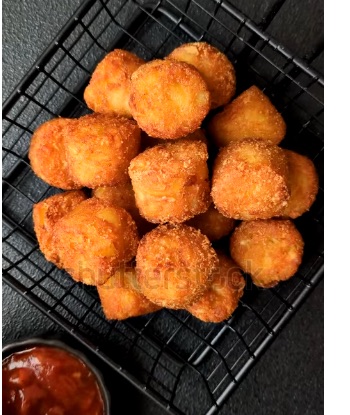 Mix all ingredients except baking powder ,when mixed add baking powder, 2 large chicken breast diced into cubes ,dip cubed chicken into batter deep frying hot fat until golden brown.