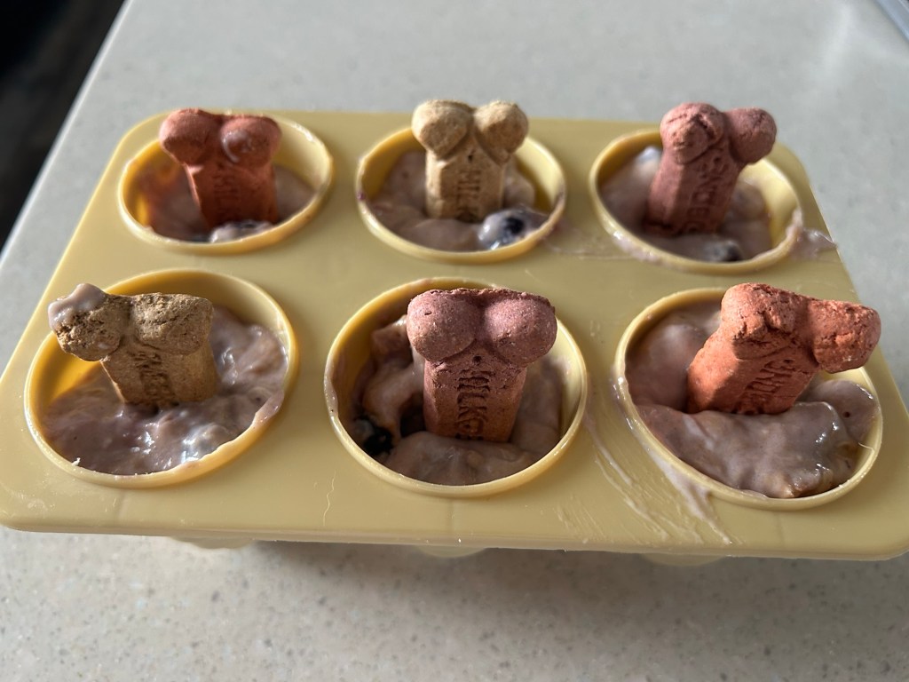 Mix all together and put in freezer cups freeze until frozen our pup Ginger loves them .