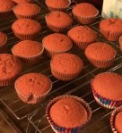 Mix eggs , butter , sugar and vanilla together until creamy. Next in a separate bowl add in oil , cocoa powder , flour , baking soda and milk and food colouring mix well . Add both mixtures together stir well using muffin liners or a greased muffin tins .Bake at 350 for 13 to 15 mins or until the cake tester stick comes out clean .When cooled poke hole in the top of the muffins with the end of a wooden spoon , then fill up the hole with icing and the top of muffins . Makes about 24 muffins .Which is good cause my kids love them .