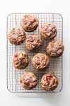 Mix egg , milk , oil stir well then add baking powder , sugar and flour continue stirring slowly add rhubarb and strawberries .In a lined muffin tins pour at least 3/4 full of batter . Bake at 375 for 20 mins out until cake tester comes out clean .