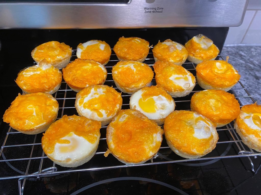 Mix eggs , milk together until blended , stir in cheese and other additives. Pour into greased muffin tins bake at 325 for 25 minutes.